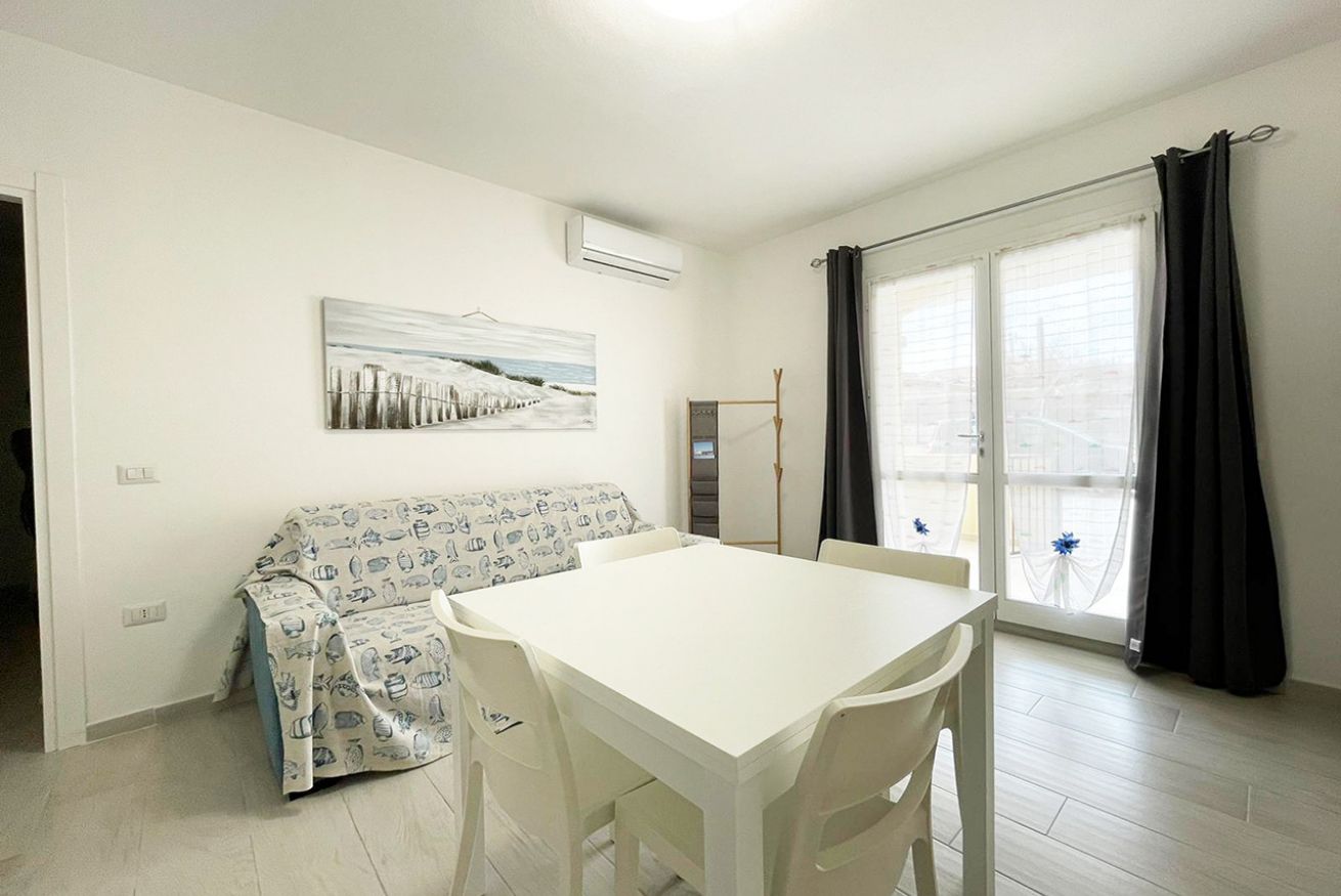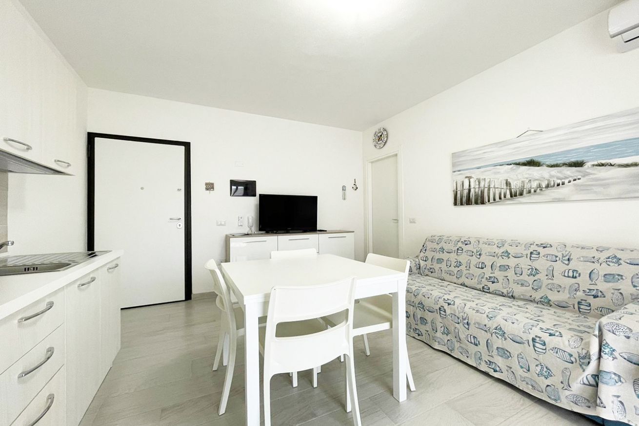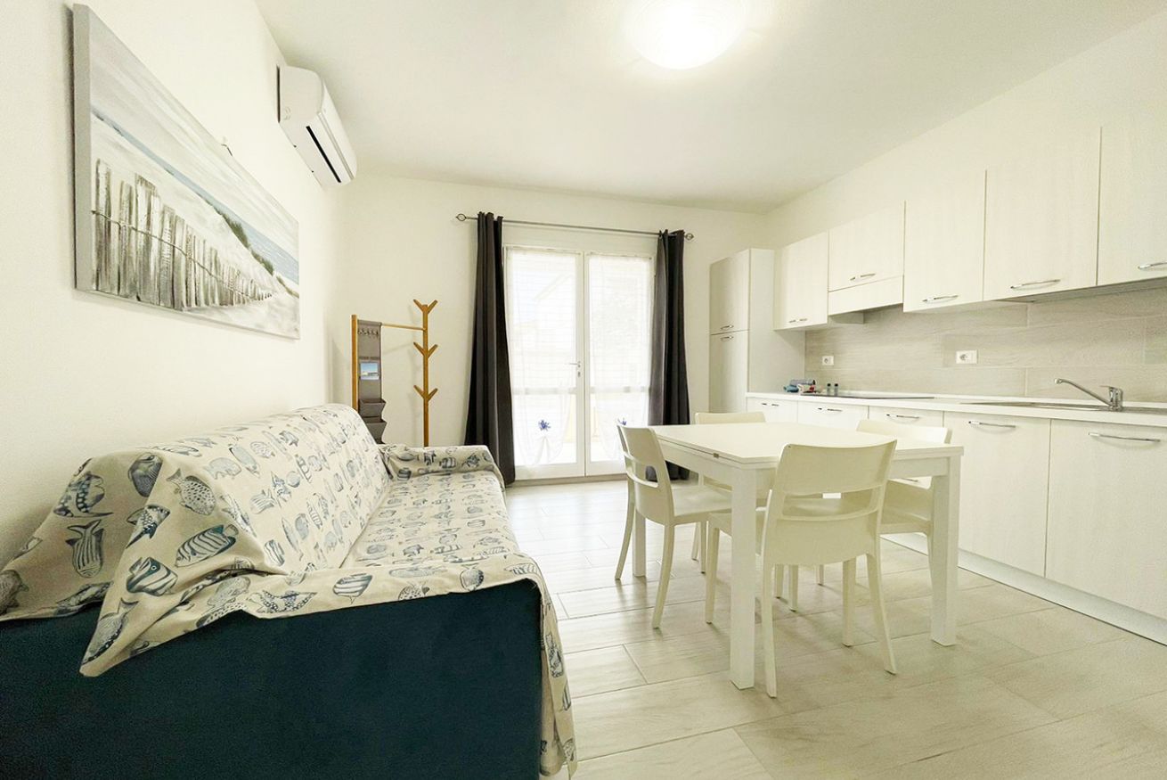 L’immobile è ubicato al piano terra in condominio di recente costruzione ed è composto da soggiorno cucina con divano letto matrimoniale, camera matrimoniale, cameretta con due letti singoli, bagno con box doccia e terrazza attrezzata.