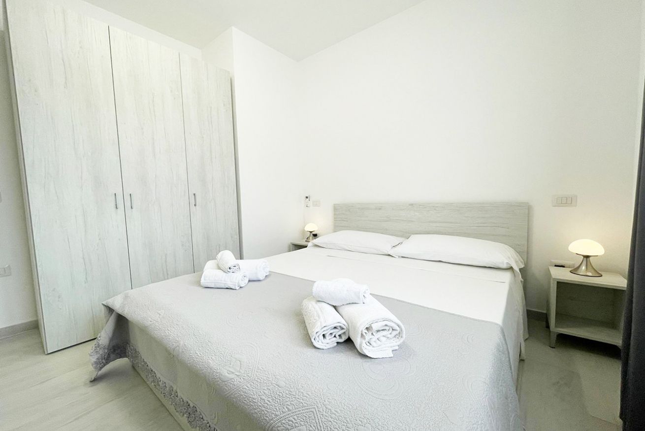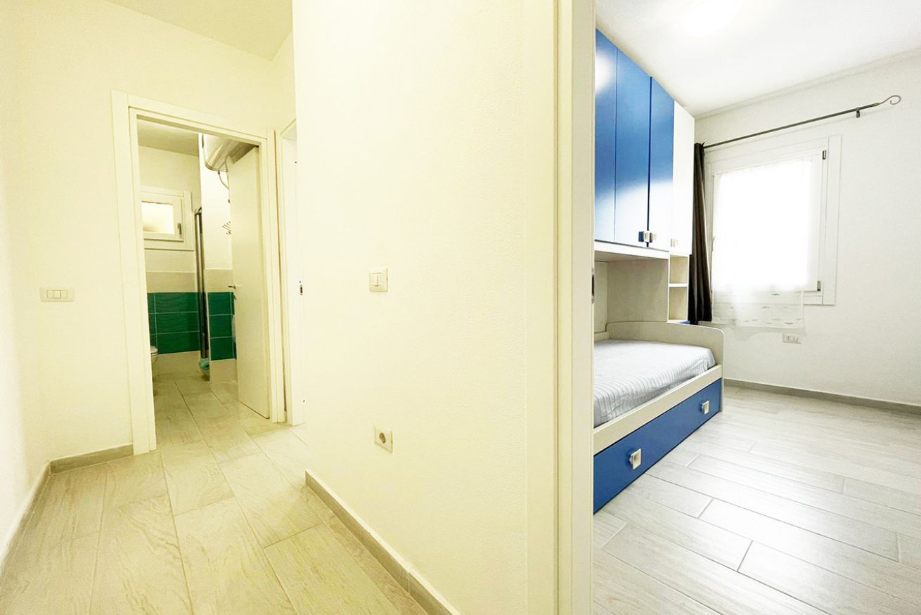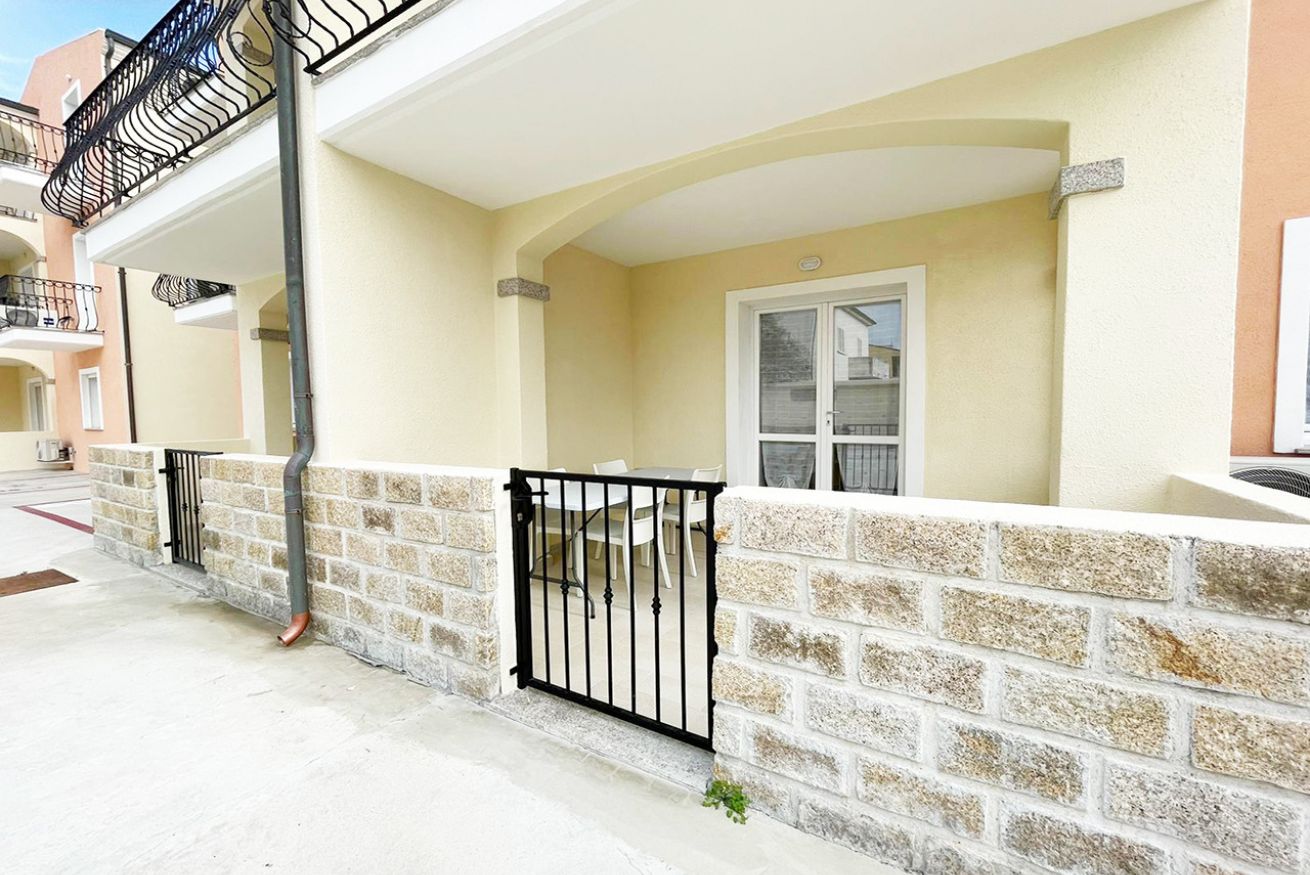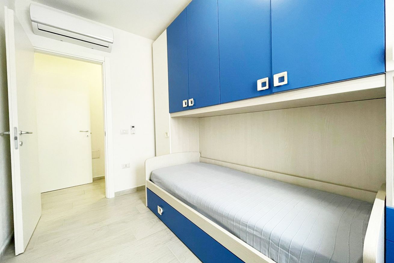 L’immobile è ubicato al piano terra in condominio di recente costruzione ed è composto da soggiorno cucina con divano letto matrimoniale, camera matrimoniale, cameretta con due letti singoli, bagno con box doccia e terrazza attrezzata.