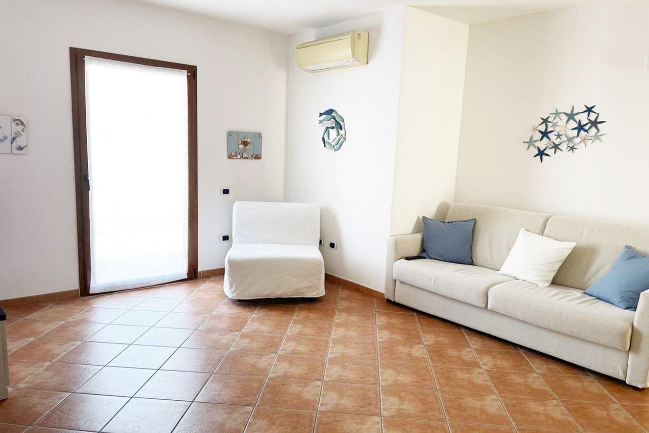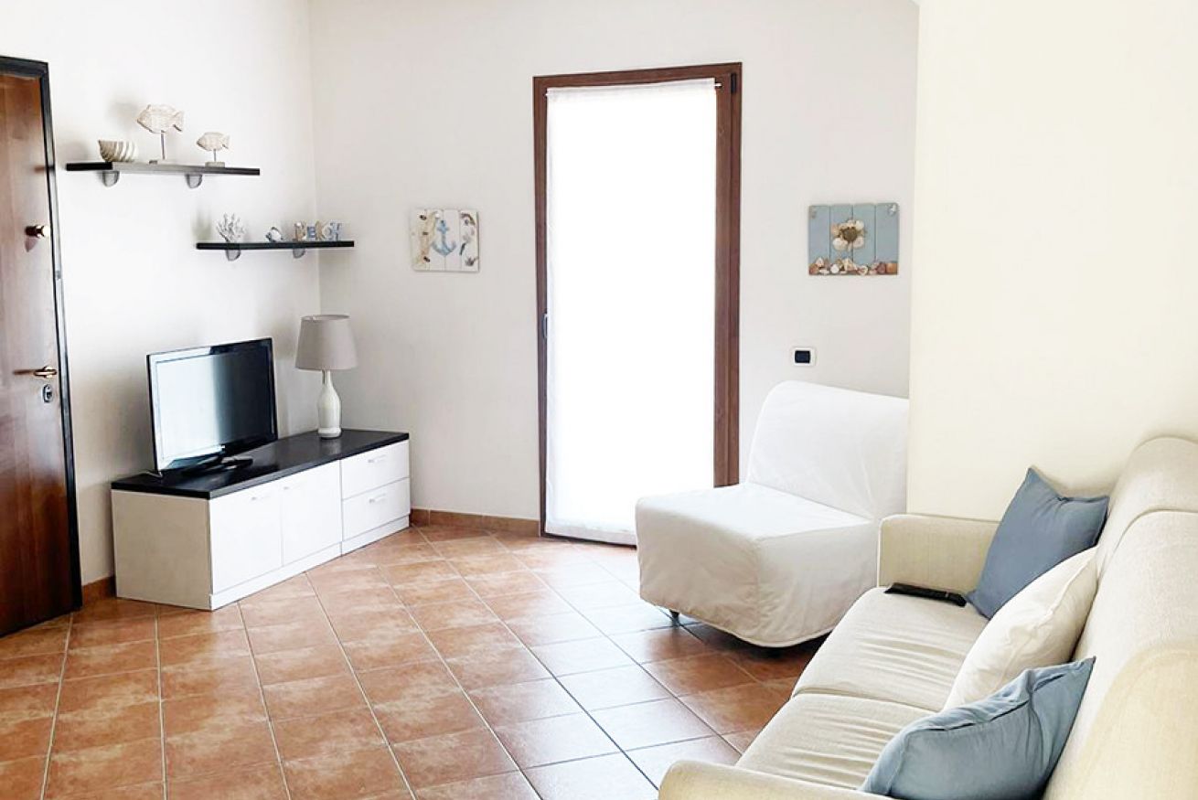 L’appartamento è composto da soggiorno con angolo cottura e divano letto matrimoniale, camera da letto matrimoniale, terrazza attrezzata e bagno con box doccia.